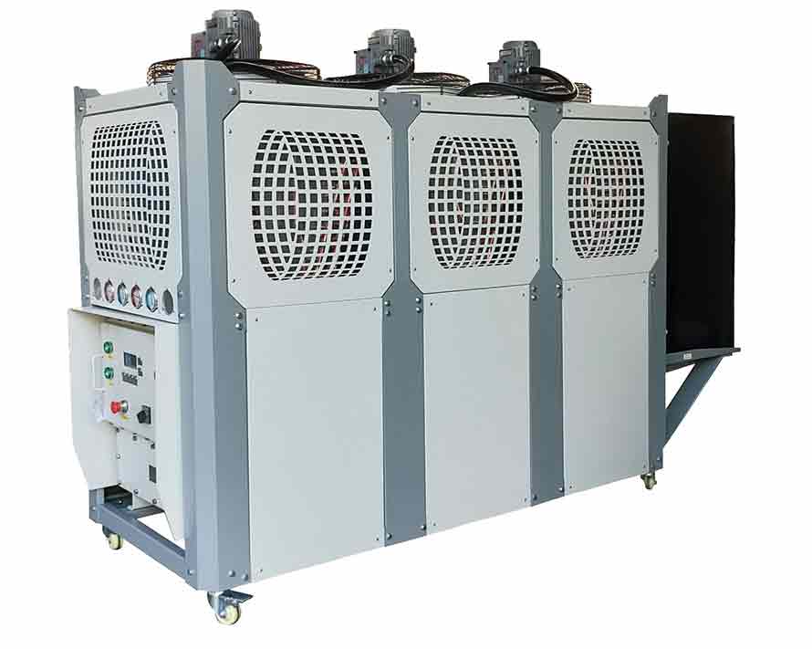 風冷式防爆型化工制冷機組通過風扇以空氣為冷凝方式的控溫設備,有箱式和螺桿式,單機輸出馬車從1HP~220HP.